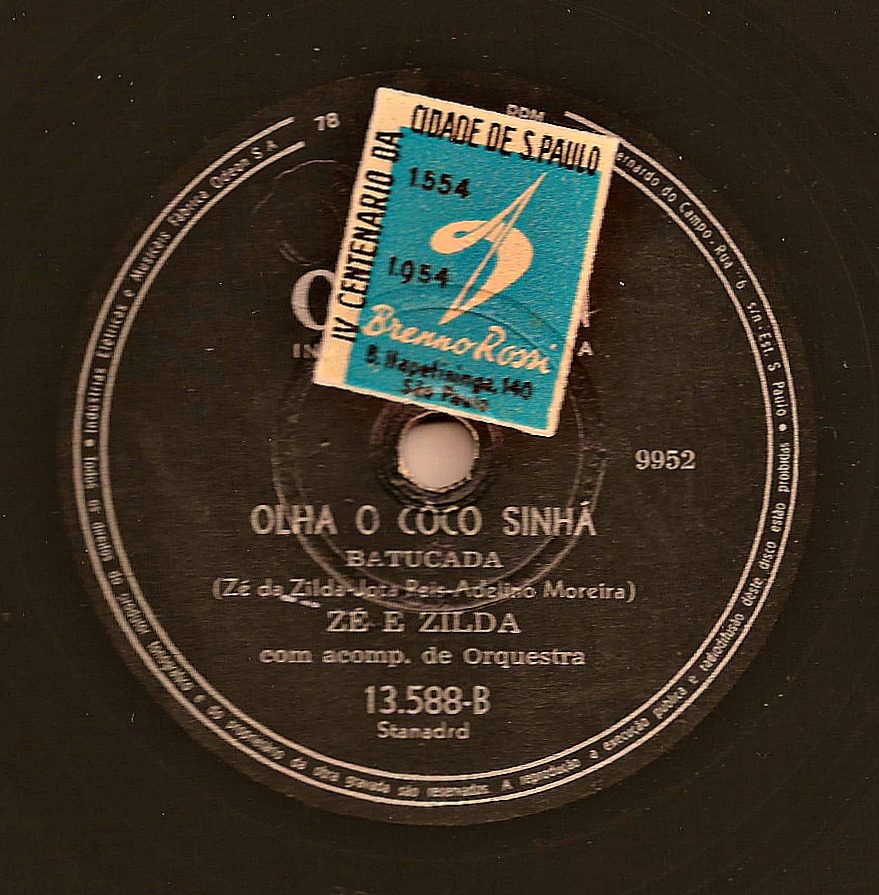 I found a few Brazilian records there, mostly samba songs of the early 50’s. My favourite one, “Olha o côco Sinhá” (Odeon Brazil), was performed in 1953 by Zé e Zilda, a duo composed of Zé da Zilda (José Gonçalves) and his wife Zilda do Zé (Zilda Gonçalves). I didn’t find much information about them in English, except this biography of Zé da Zilda on Allmusic.com. Portuguese-reading people can find more details in this online encyclopedia devoted to Brazilian popular music.