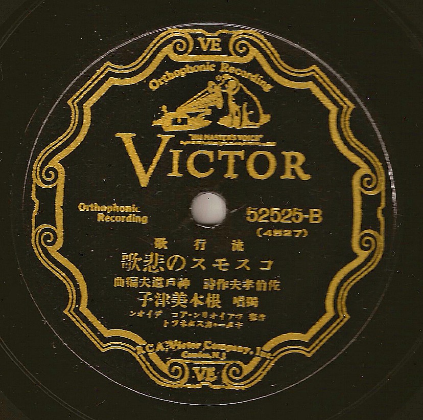 I did my best but hardly found any information about this melancholic waltz from a Victor Japan record... With patience (and a very useful online dictionary), I managed to decipher the Japanese characters on the label. Here is what I discovered : The song is called "Cosmos Elegy" (コスモスの悲歌, Cosmos referring in that case to a … Continue reading Cosmos Elegy (コスモスの悲歌) A mysterious Japanese waltz on 78 rpm record
